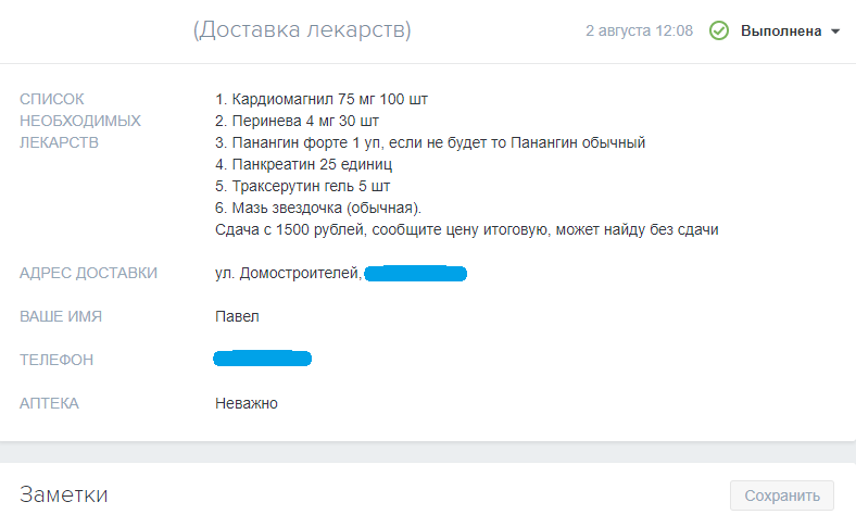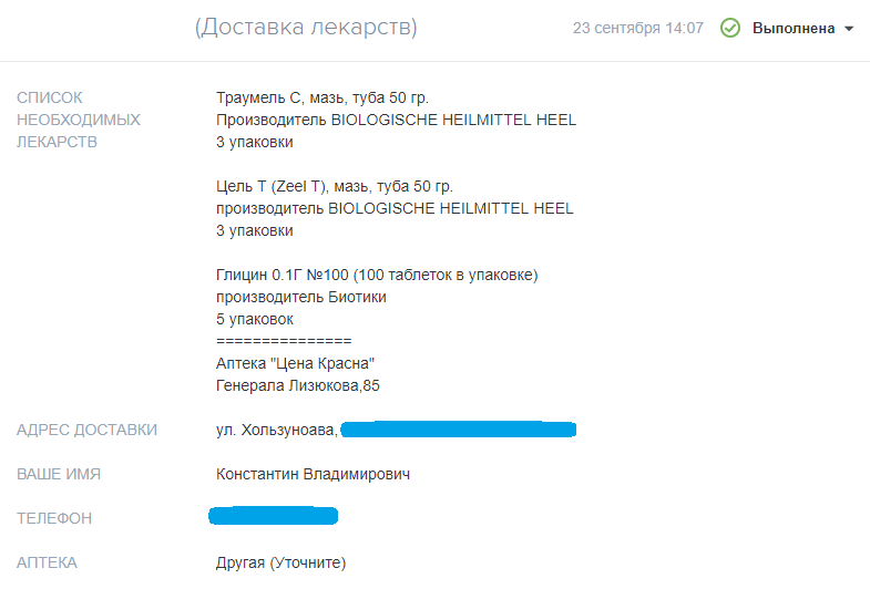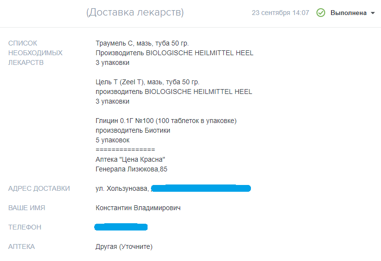 Сотрудник направляется в указанную аптеку, покупает лекарства и доставляет до Вашей двери.