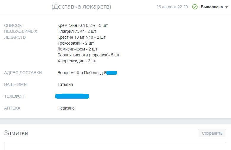 Выражаю огромную благодарность за оказанную услугу. Жена с малолетним ребёнком дома болеют в Воронеже. Из Москвы звонил, обговорили необходимые лекарства. Очень оперативно купили и доставили. От звонка до доставки меньше двух часов. Удобно оплатил через сбербанк онлайн. Ещё раз большое спасибо!