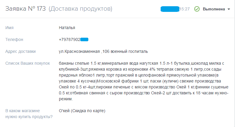 Да! Мы уже не раз принимали заявки на доставку продуктов от людей, которые находятся за пределами Воронежа. Если у близкого Вам человека нет возможности самостоятельно купить продукты, то мы будем рады помочь. Вы также можете оплатить услугу электронным переводом средств на карту сбербанка после доставки заказа.